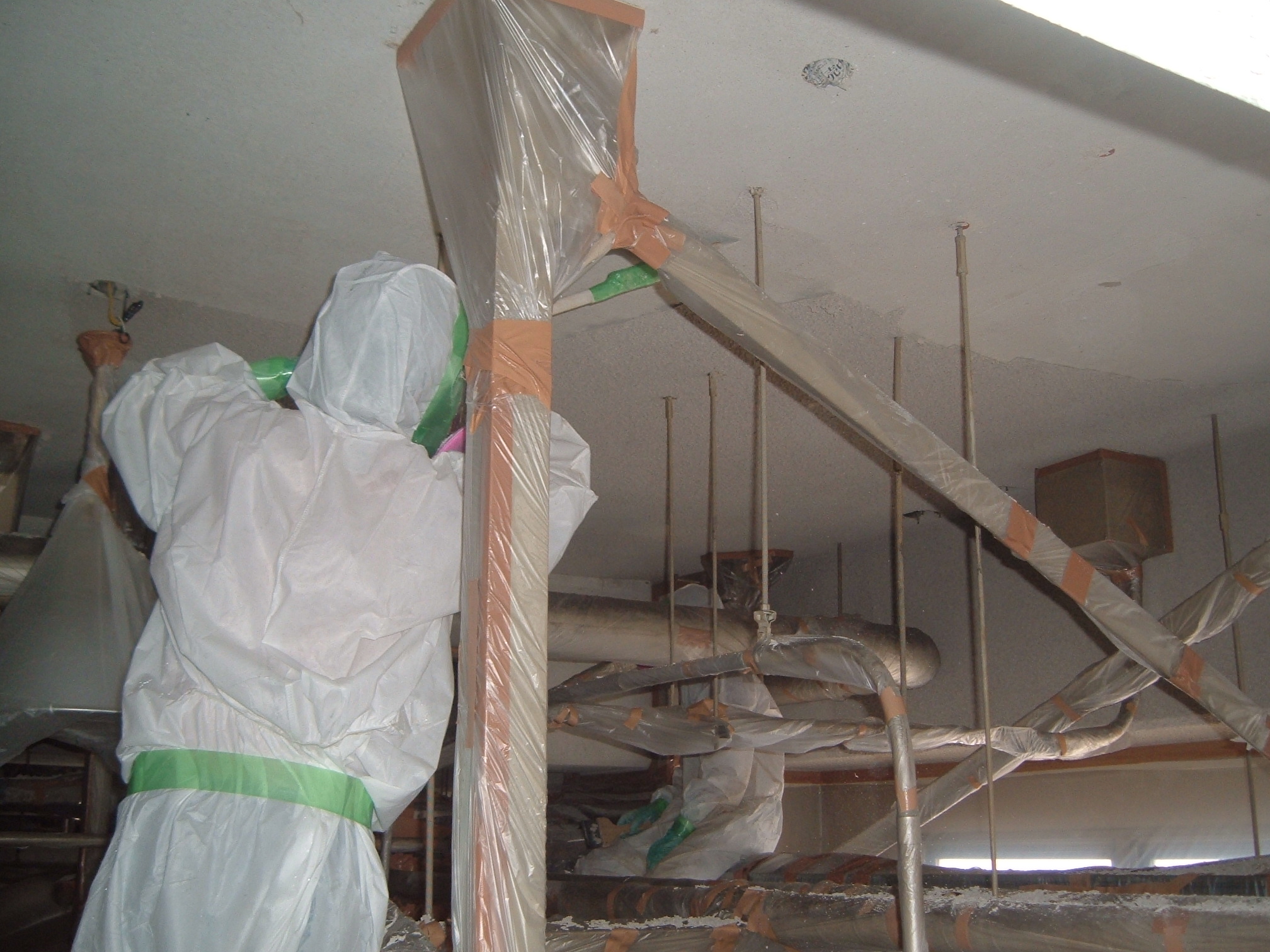 アスベスト除去作業天井面に吹付けられているアスベスト含有材の撤去作業状況